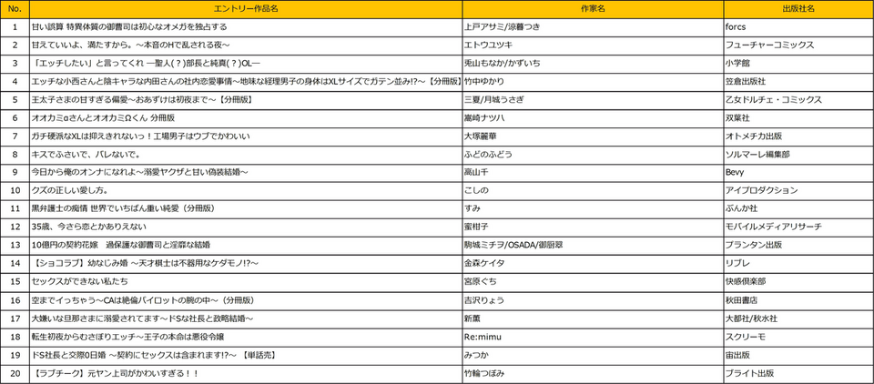 部門 :男性部門、女性部門、異世界コミック部門、ラノベ部門、BL部門、TL部門