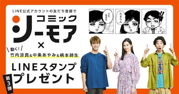 コミックシーモアオリジナルLINEスタンプ第3弾! 竹内涼真さん、中条あやみさん、柄本時生さんの CM描き下ろしマンガイラストのLINEスタンプを無料プレゼント
