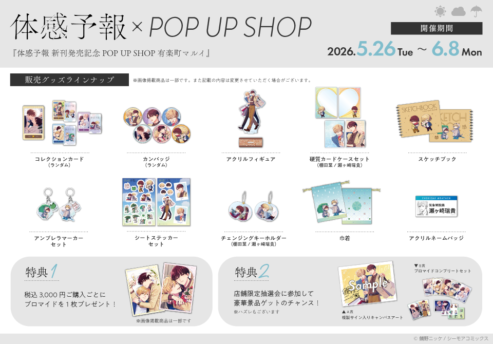 『体感予報』本編で、瀬ヶ崎と葉がデートを楽しんだ思い出の場所「有楽町マルイ」にて、期間限定POP UP SHOPを開催いたします。2人が過ごした空間で、描き下ろしイラストを使用した限定グッズを手に取る――ここでしか味わえない貴重な体験が待っています。作品の世界に入り込むような、特別なひとときを心ゆくまでお楽しみください。また、税込3,000円ご購入ごとに豪華景品が当たる抽選会も予定しております!